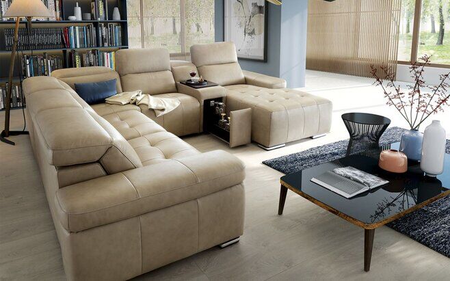 Efektowny wizualnie dzięki swojej masywnej bryle i stonowanej stylistyce – tak jednym zdaniem można określić system modułowy Domo, który spełni wszystkie Twoje oczekiwania w zakresie elegancji, estetyki i formy. Sofa lub narożnik Domo może być wyposażony m.in. w poręczny barek z drewnianym blatem, funkcję spania, duży pojemnik na pościel oraz fotel z funkcją relaksu, co razem z ruchomymi zagłówkami stanowi idealne połączenie wygody, nowoczesnego designu oraz funkcji użytkowych.