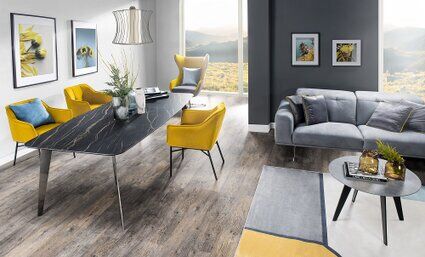 Stół Basserto to mebel zaprojekotwany zgodnie z najnowszymi trendami. Blat wykonany został ze spieku włoskiego w kolorze Noir Desir Mat oraz szkła , aby nadać meblu lekkości szkło zostało podcięte. Nóżki są chromowe. Kształt blatu nie jest typowym prostokątem lecz przypomina tzw kształt beczki.