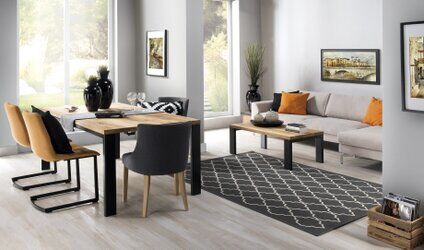 Prezentujemy salon urządzony w klimacie Loft kolekcja mebli NESTO. W stylu loftowym do produkcji mebli wykorzystano przede wszystkim naturalnych materiałów takich jak stal, drewno czy beton a także szkło. Meble również na indywidualne zamówienie według sugestii klienta. Meble wykonane z litego drewna dębowego olejowanego w połączeniu z metalem. Podstawa malowana proszkowo na czarno.